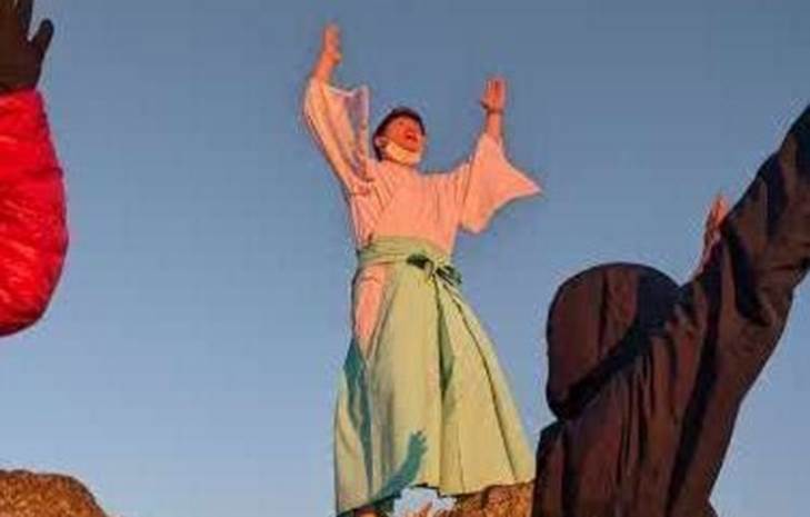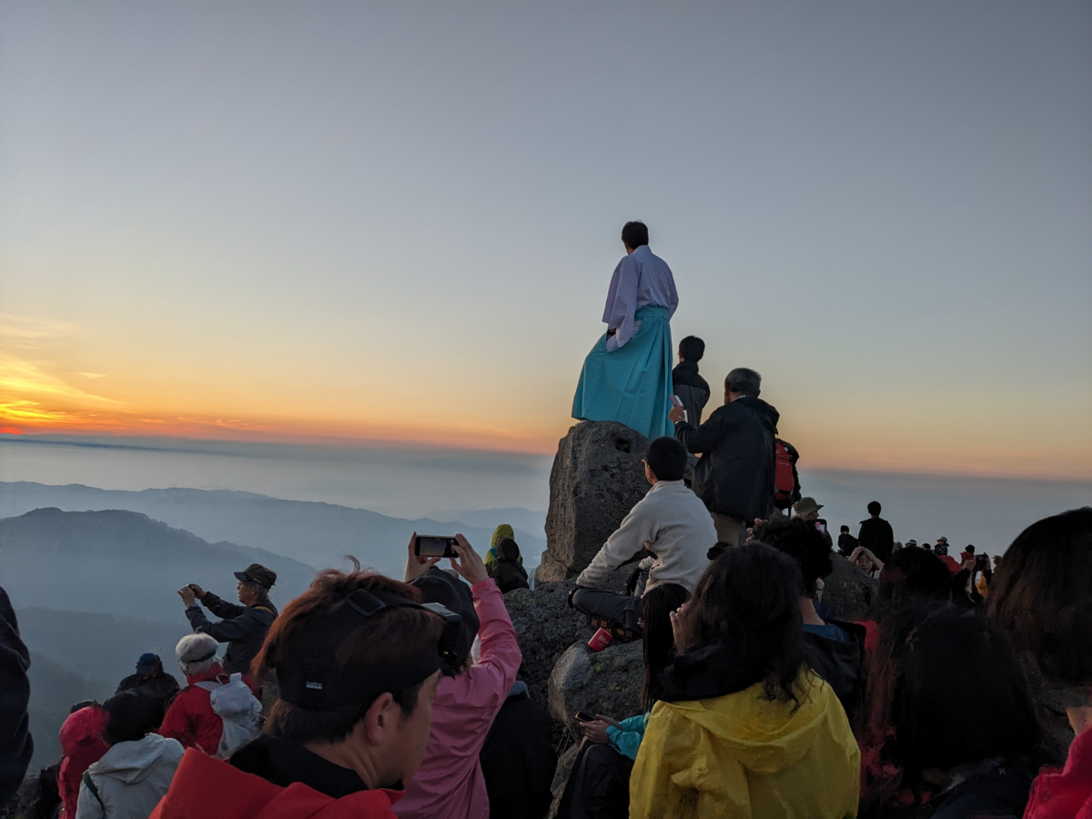 白山ひめ神社の神職さんをはじめ、多くの登山者が日ノ出を待っています。