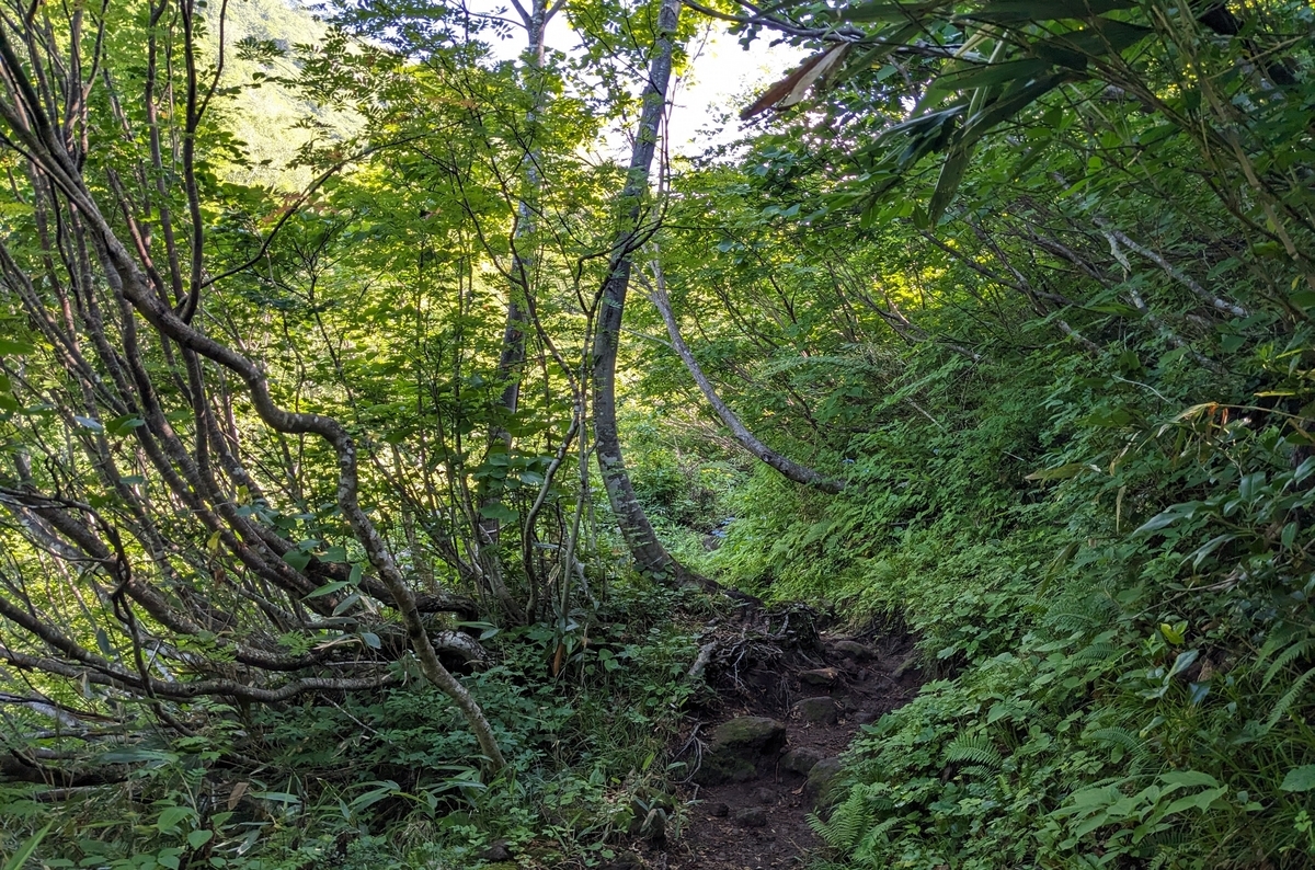 11時10分 尾根道への最後の登り「別当坂の頭」に到着しました。歩き始めて2時間10分、厳しいながらも順調に進んでいます。いよいよ展望とお花畑の歩きが始まります。