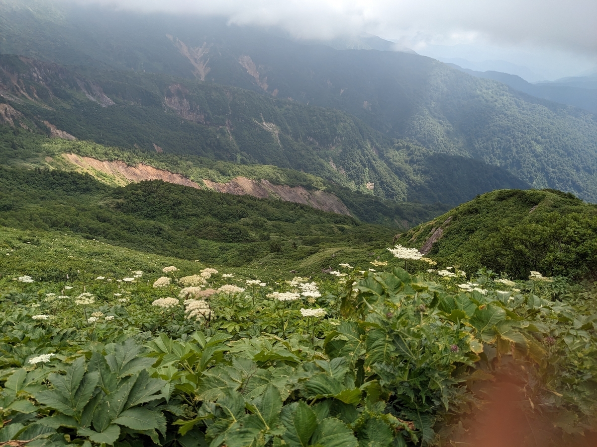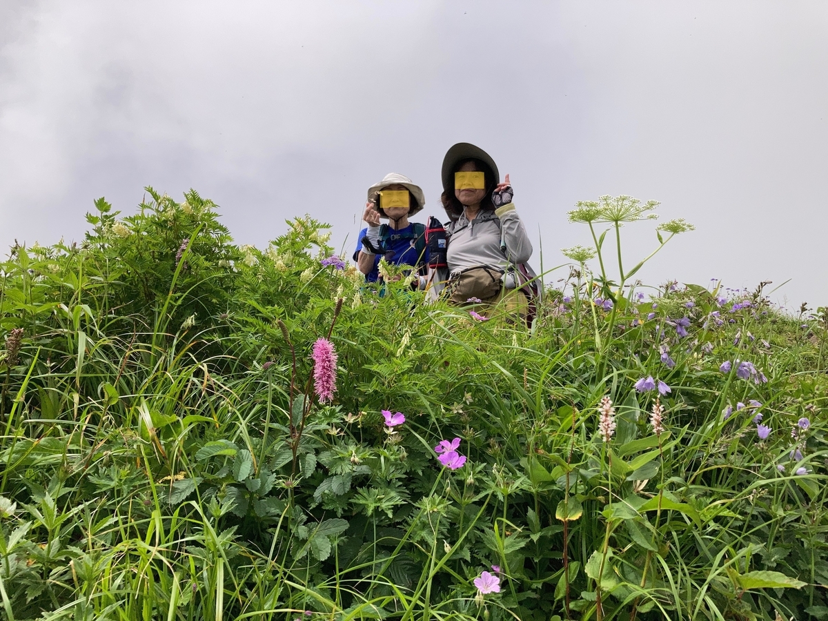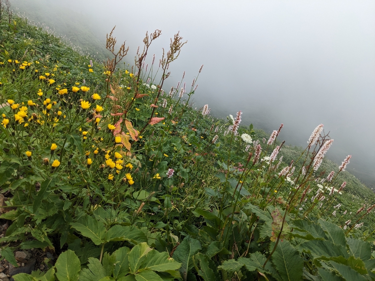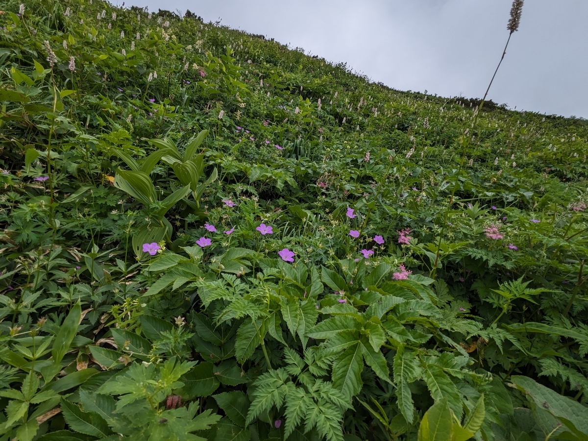 真砂坂を上り始めると、ハクサンフウロ、カライトソウ、ミヤマキンポウゲなどの花が次々と現れます。またニッコウキスゲ、ミヤマシャジン、タカネナデシコ、クルマユリ、ヨツバシオガマなどの花々、、、まさに百花繚乱のお花畑が広がっていました。