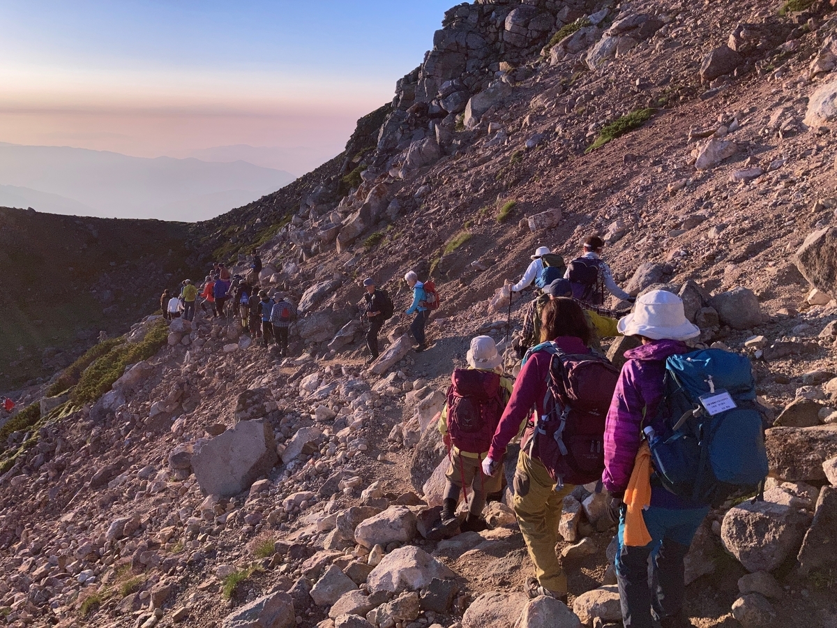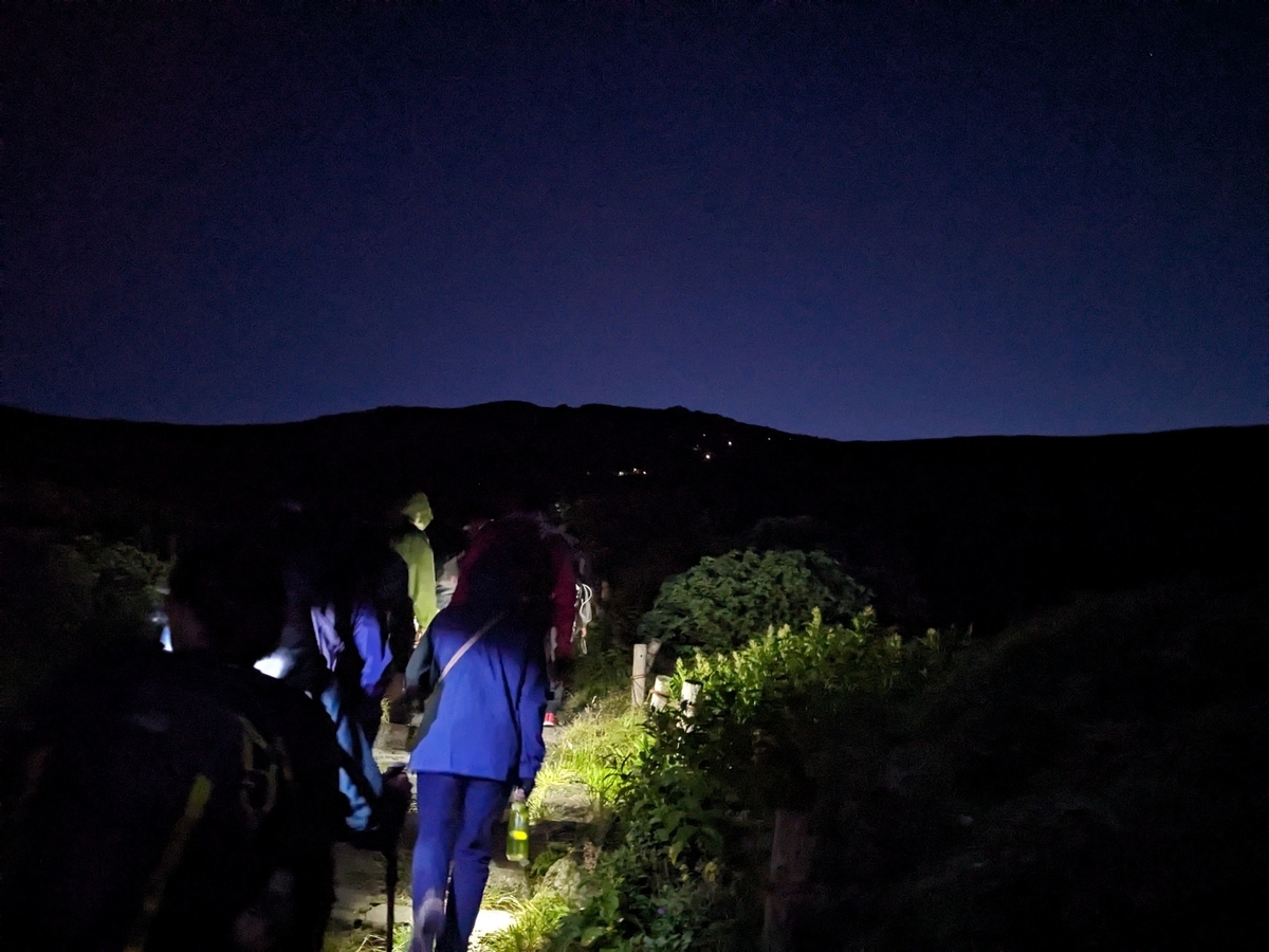 2日目、朝4時 「日ノ出」の合図の太鼓が鳴り響きます。私達もまだ暗い中を出発します。山側をみるとヘッドランプの明かりの列が山頂近くまで伸びています。
