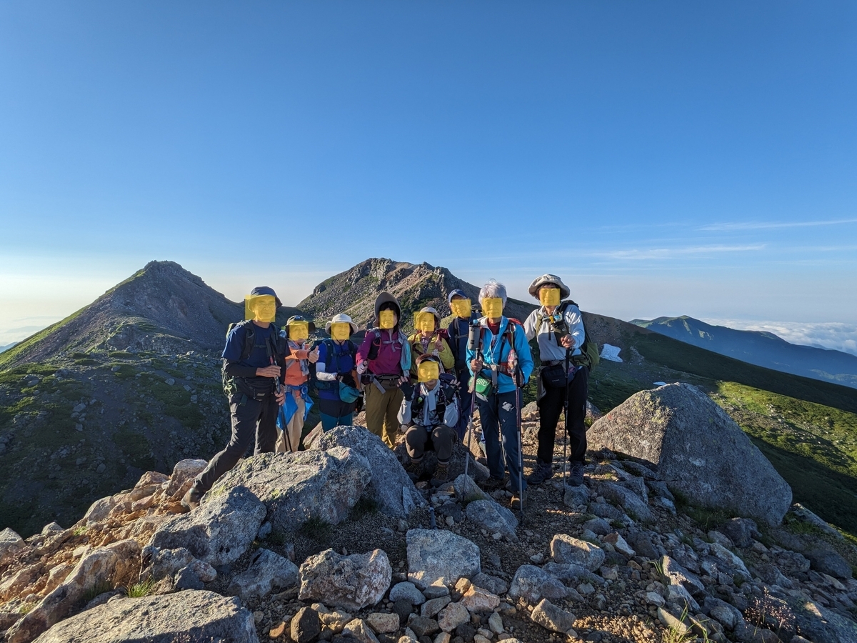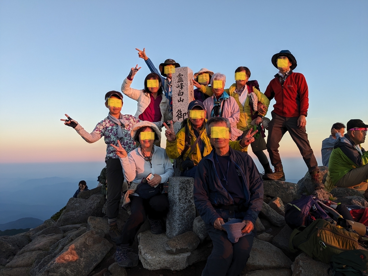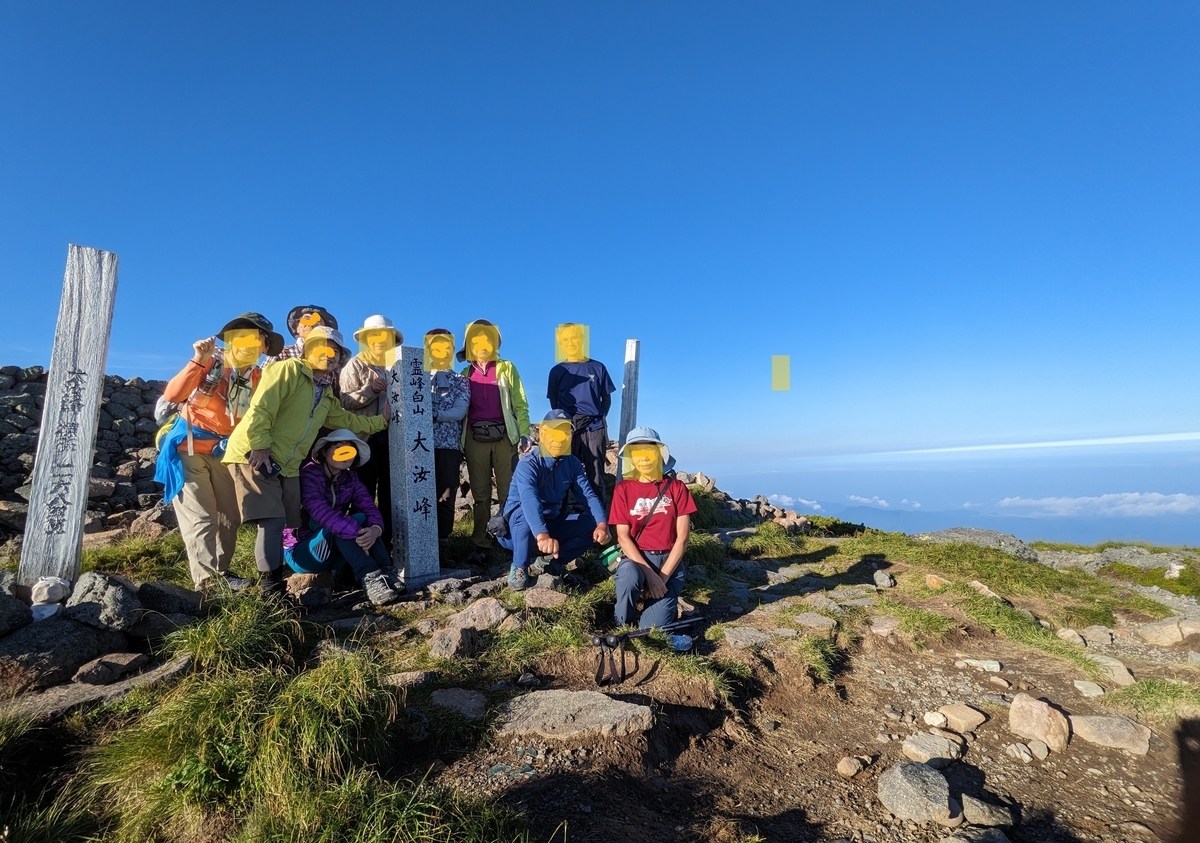 さて、私にとって白山はコースを変えながら幾度も来ている山で、いつ来ても楽しめる山、これからも上りたい山の一つです。しかし年々脚力の低下を感じ、今年歩けた山が来年も歩けるとは限らない年齢に近づきつつあります。今回の猛暑の中の山行を通じその事を改めて実感したところです。平素、荷物の軽量化と負荷訓練、行動食・水分補給の工夫などをしているのですが、今後も更に継続していかねば、と改めて思った山行ともなりました。(文責743)