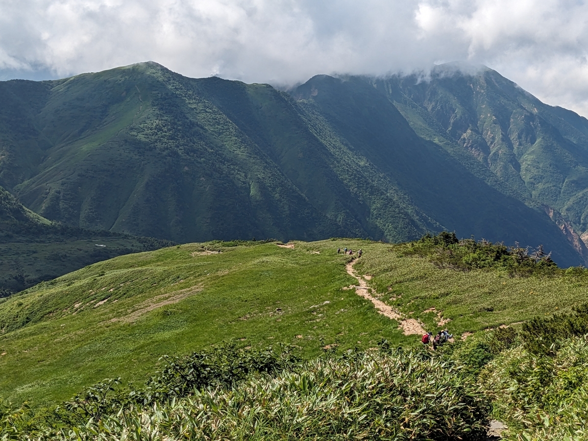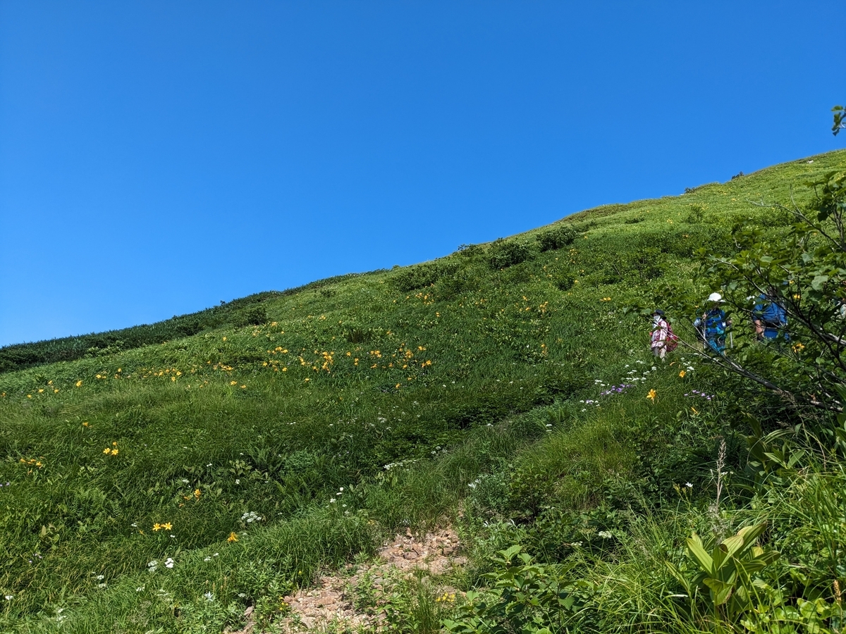 南竜分岐近くまで下ってきました。振り返るとニッコウキスゲが綺麗に咲いています。