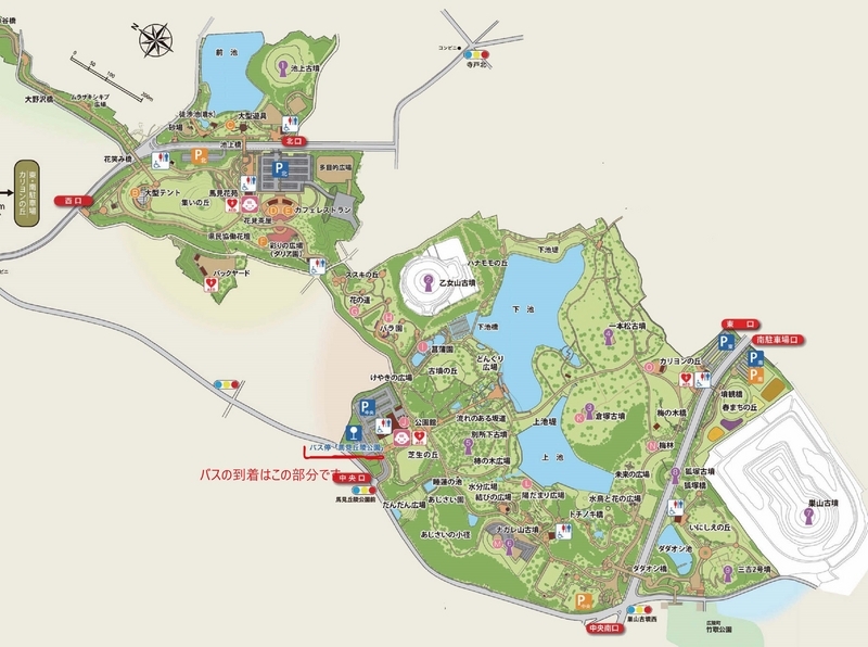 15分ほどバスに乗り 馬見丘陵公園バス停1分でトイレ、2分で公園館に着きます。