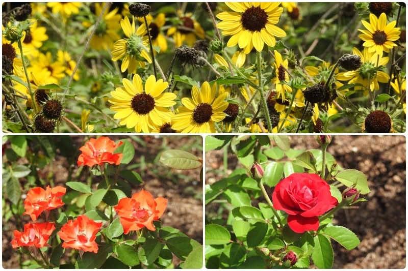 小形ヒマワリ(ほぼ咲き終わり)とバラ2種類(まだ咲き始め)