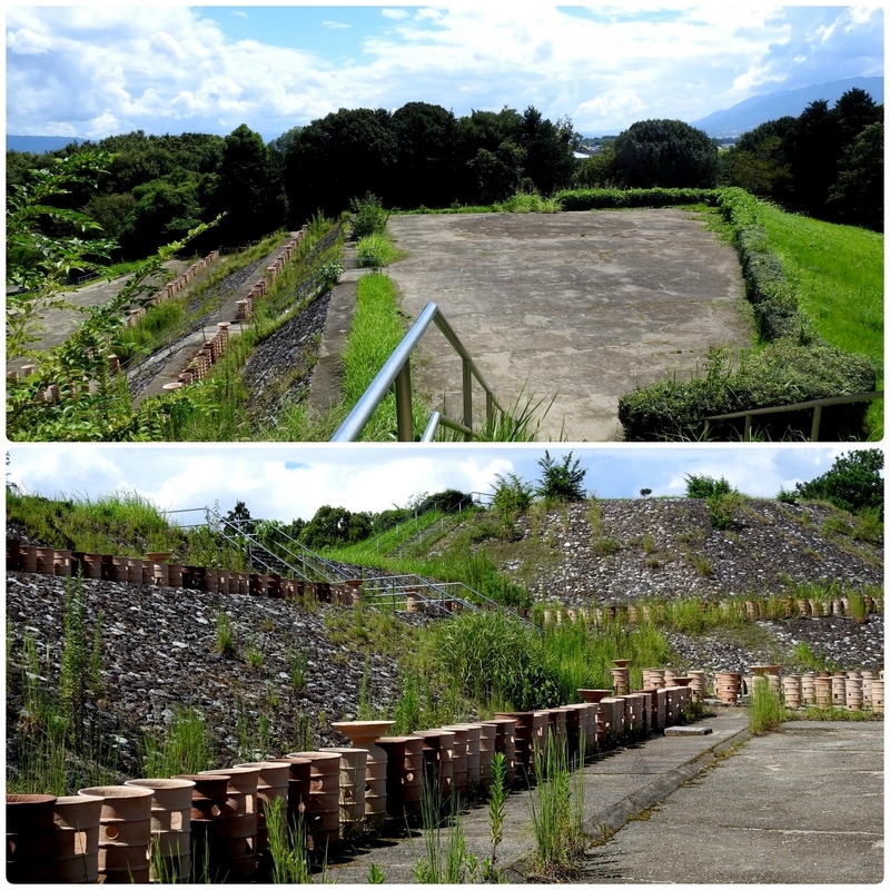 ナガレ山古墳 半分が埴輪に囲まれた石畳みの作られた時の姿、半分が草に覆われた